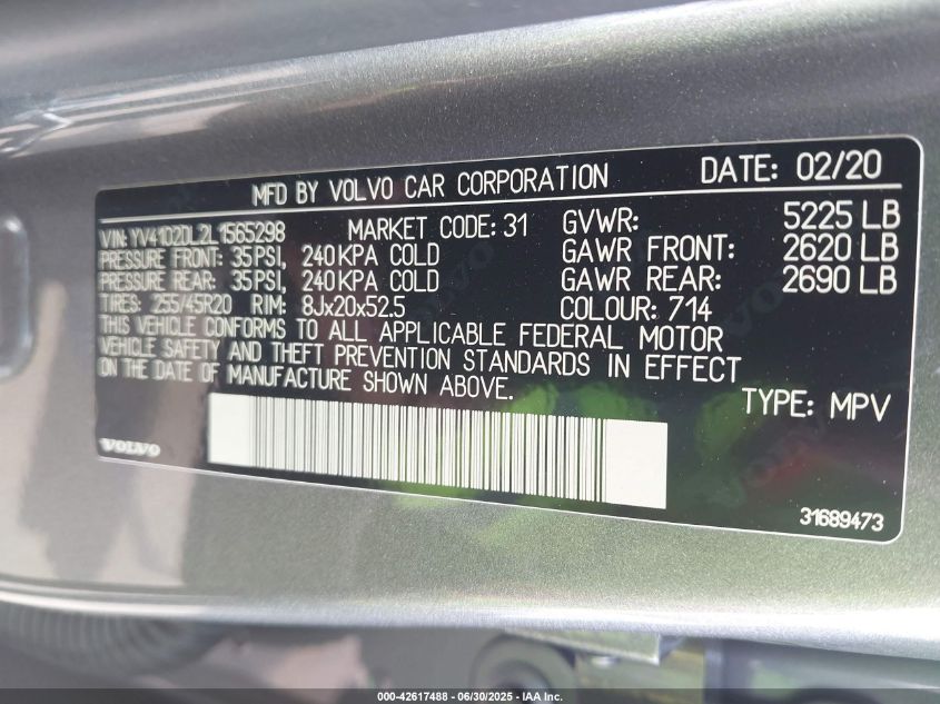 2020 VOLVO XC60 | YV4102DL2L1565298