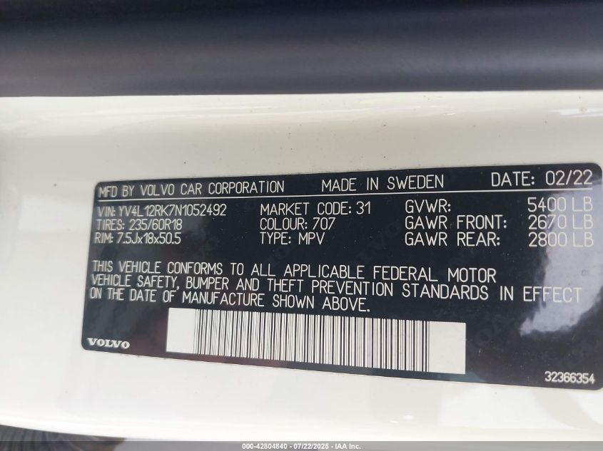 2022 VOLVO XC60 | YV4L12RK7N1052492