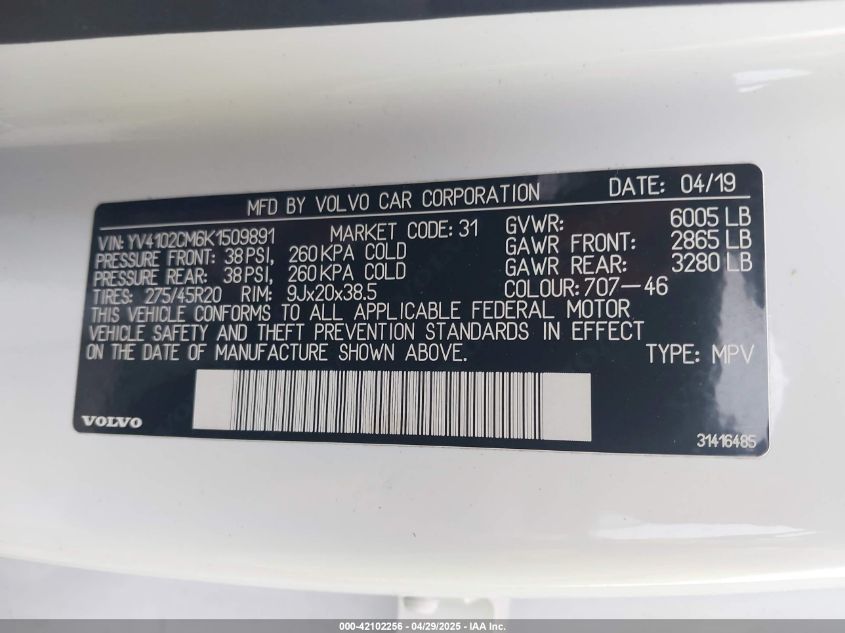 2019 VOLVO XC90 | YV4102CM6K1509891