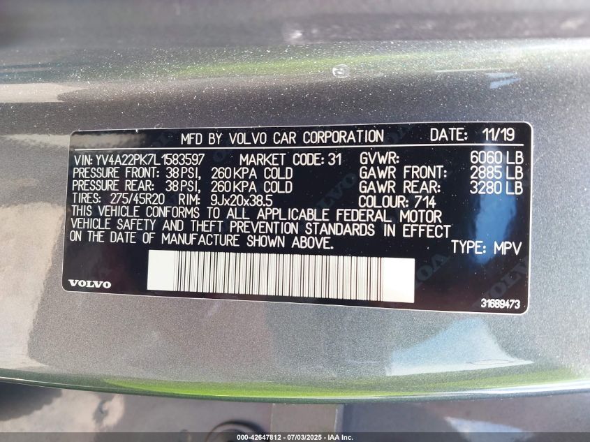 2020 VOLVO XC90 | YV4A22PK7L1583597